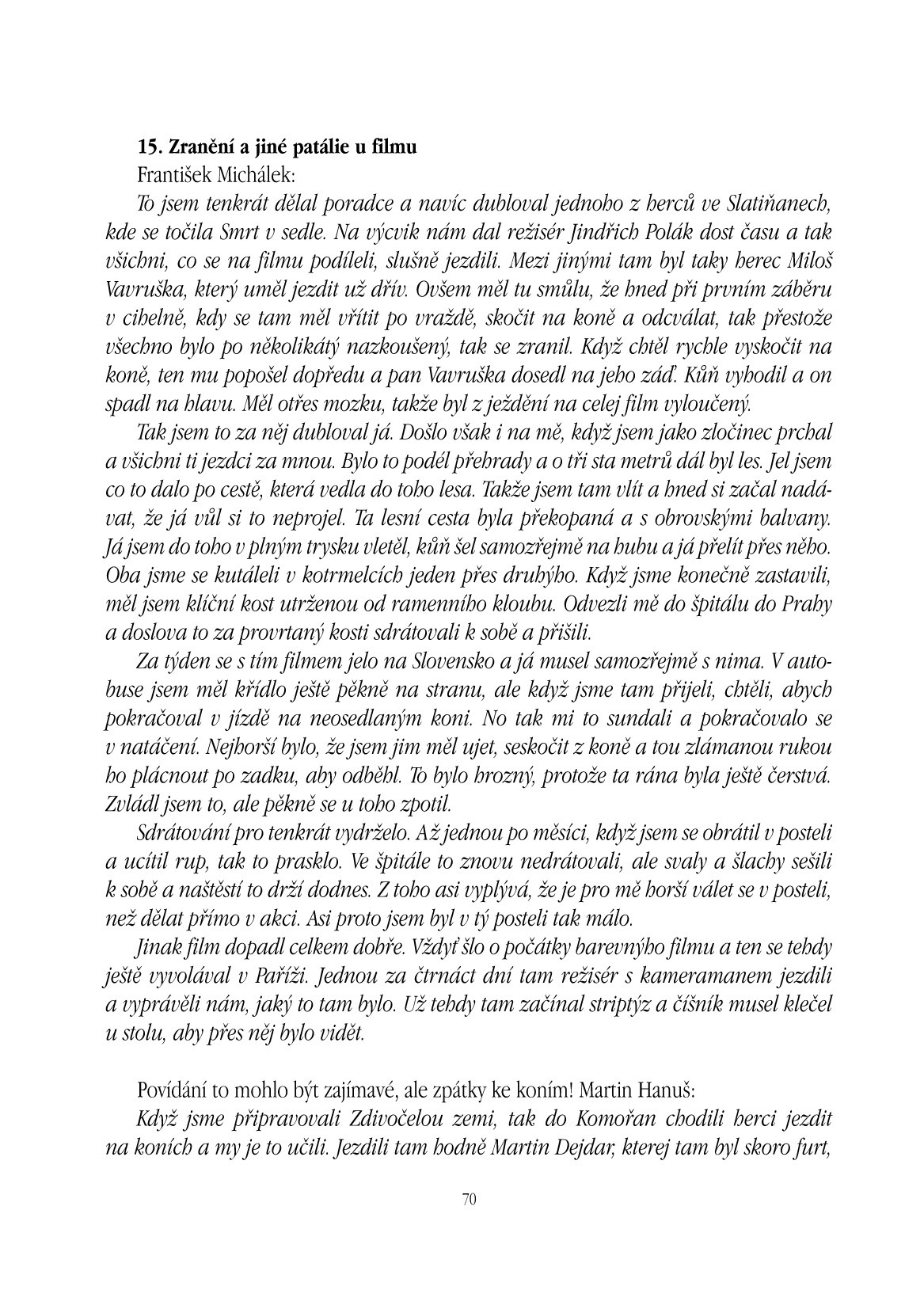 Druhá kniha Pavla Jahody se věnuje jedné z nejvděčnějších, ale také nejobtížnějších prací s koněm –, natáčení filmů. Čtenář se poutavou formou vyprávění zkušených filmařů-koňáků seznámí se spoustou nejroztodivnějších příběhů, patálií a historek, čímž se dozví množství potřebných informací o práci s koněm při filmovém natáčení. Kniha představí nejen přípravu tohoto zvířete na tuto náročnou práci, ale také pohled na věc z perspektivy samotného koně, po kterém jsou vyžadovány nejrůznější herecké výkony v uměle navozených podmínkách. Zábavné, obdivné a zároveň naučné vyprávění, které nabízí pohled do zákulisí filmové práce a v jednotlivých kapitolách vystupuje řada známých osobností filmového plátna, je doplněno o barevnou fotografickou přílohu.