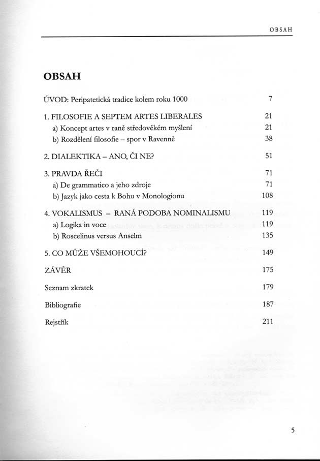 Kniha se na vybraných tématech myšlení 10. a 11. století věnuje důležitosti peripatetické tradice v rámci tehdejšího (nejen) filosofického dialogu. Postupně se věnuje konceptu sedmi svobodných umění a snaze o začlenění filosofie do tohoto konceptu, otázce dělení věd (filosofie), rozvoji dialektiky (logiky) a užívání dialektických postupů v nejrůznějších oblastech lidských teoretických aktivit této doby, filosofii jazyka (sémantice), opětovně především se zřetelem na nepřehlédnutelnou roli Aristotelových spisů (především Kategorií, ale také důležitost díla O vyjadřování), sporu o univerzálie, především pak tzv. vokalismu, ovšem stranou pozornosti nezůstávají ani teologické přesahy raně nominalistických koncepcí, které vedly např. ke sporu o výklad trojjedinosti Boha. Na závěr je řešen problém, který je na jedné straně inspirován Aristotelovým pojednáním O vyjadřování, zároveň je v něm bytostně přítomná rovněž náboženská pravda – výklad omnipotence boží. S tímto tématem úzce souvisí úvahy o determinaci a svobody lidské vůle, budoucích náhodných a svobodných událostech, předvědění a předurčení, spravedlnosti a neměnnosti Boha atp.