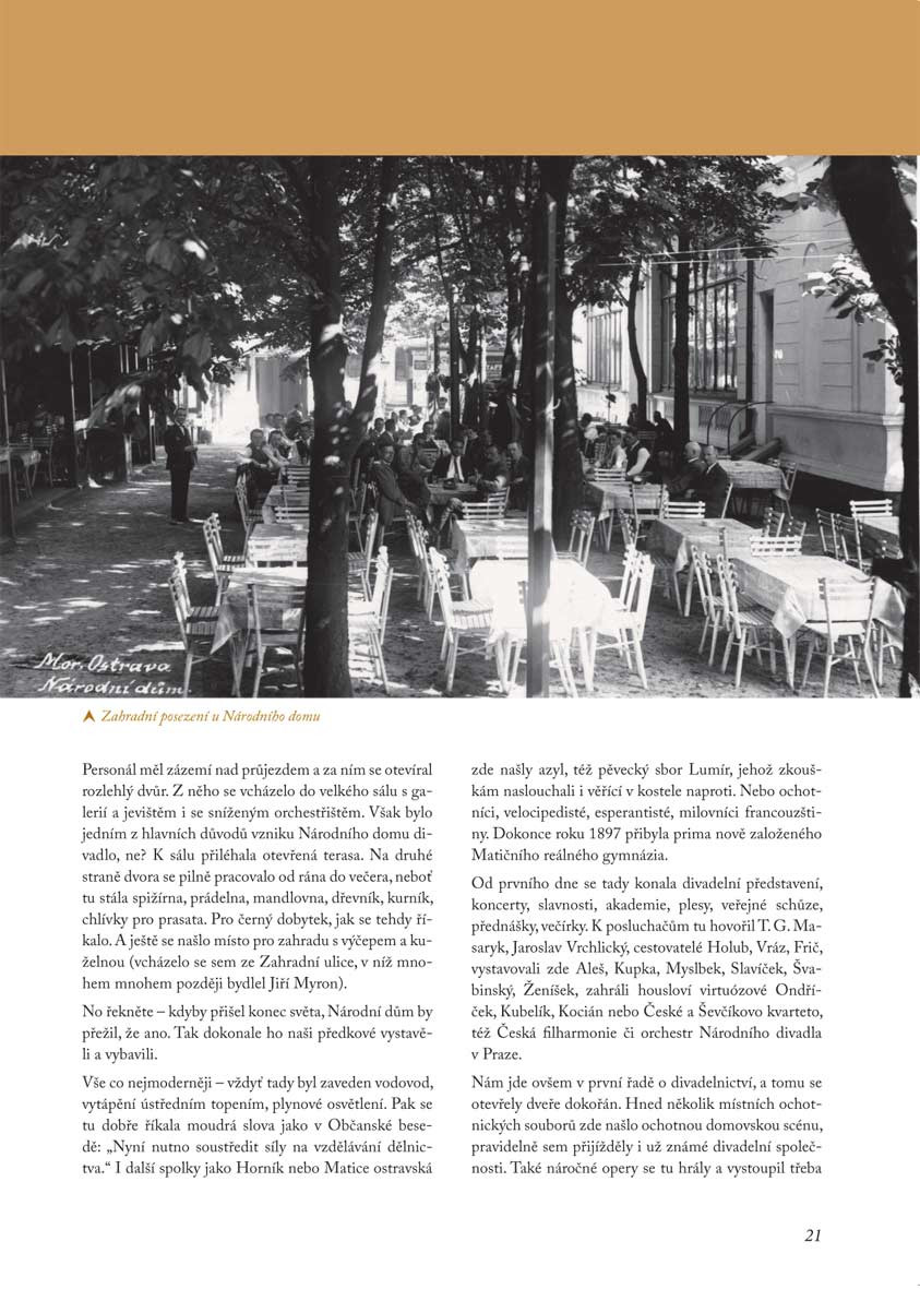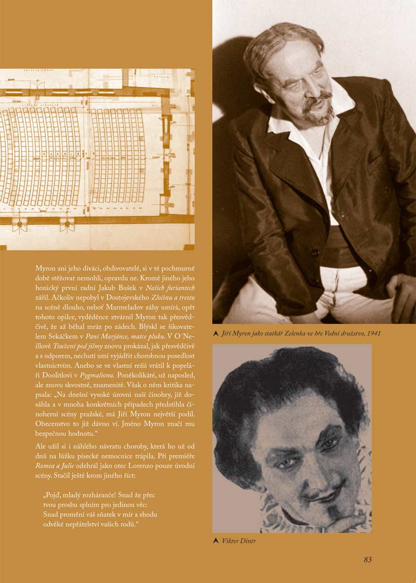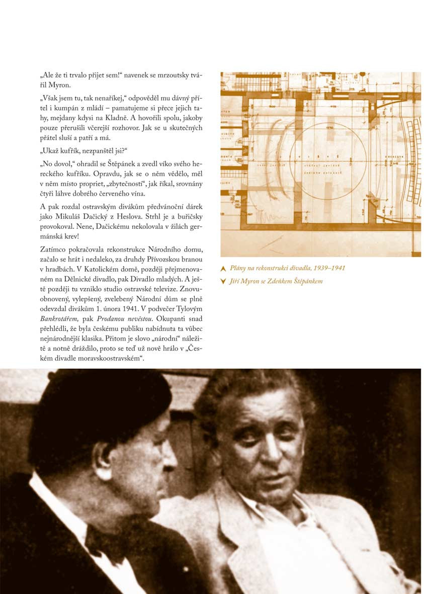 Kniha B. Žárského Dal jméno divadlu je profilem nejenom významné osobnosti na „prknech“ divadelních i jiných, ale celé jedné éry kulturního života ostravského. Od roku 1923 do začátku padesátých let 20. století patřil herec a režisér Jiří Myron (vl. jm. Bohumil Prošek) k hybatelům kulturního života města na jevišti, v zákulisí, v kavárnách i výtvarných salonech. Kniha je tak mimo jiné připomínkou toho, že Ostrava vždy patřila ke kulturním centrům, na což se někdy rádo zapomíná. Prostřednictvím osudů J. Myrona, prvního laureáta Ceny města Ostravy, představuje jak mnohé další postavy a postavičky typické pro umělecký kvas doby, tak vývoj Národního divadla moravskoslezského s akcentem na scénu Národního domu, dnes po prvním herci a chvíli také řediteli, pojmenovanou. Čtenáře dostane na místa a na setkání, která tvořila kulturní podhoubí pro další generace. Přiblíží mu málo známé osudy umělců, divadelní scény i města, které je dnes už o tolik jiné. A to vše lehkou, zábavnou formou a množstvím archivních fotografií v reprezentativní grafice. A až se po jejím přečtení vydá na další premiéru nové činohry nebo nového muzikálu, možná na něj dýchne i nová atmosféra místa, o kterém si myslí, že ho dobře zná. Nejen proto, že půjde „po stopách“ mistra, jehož jméno tento kulturní stánek po právu nese.