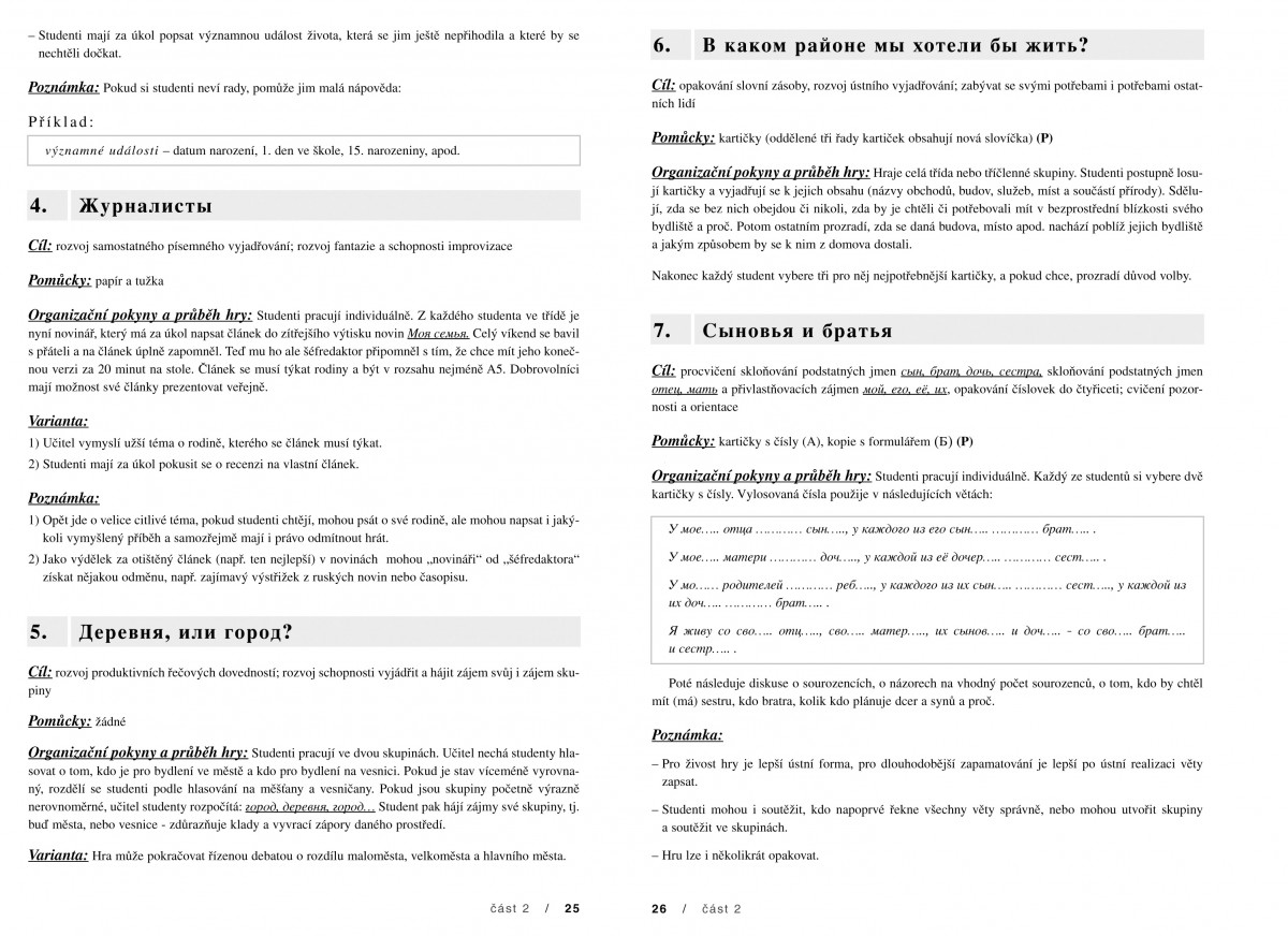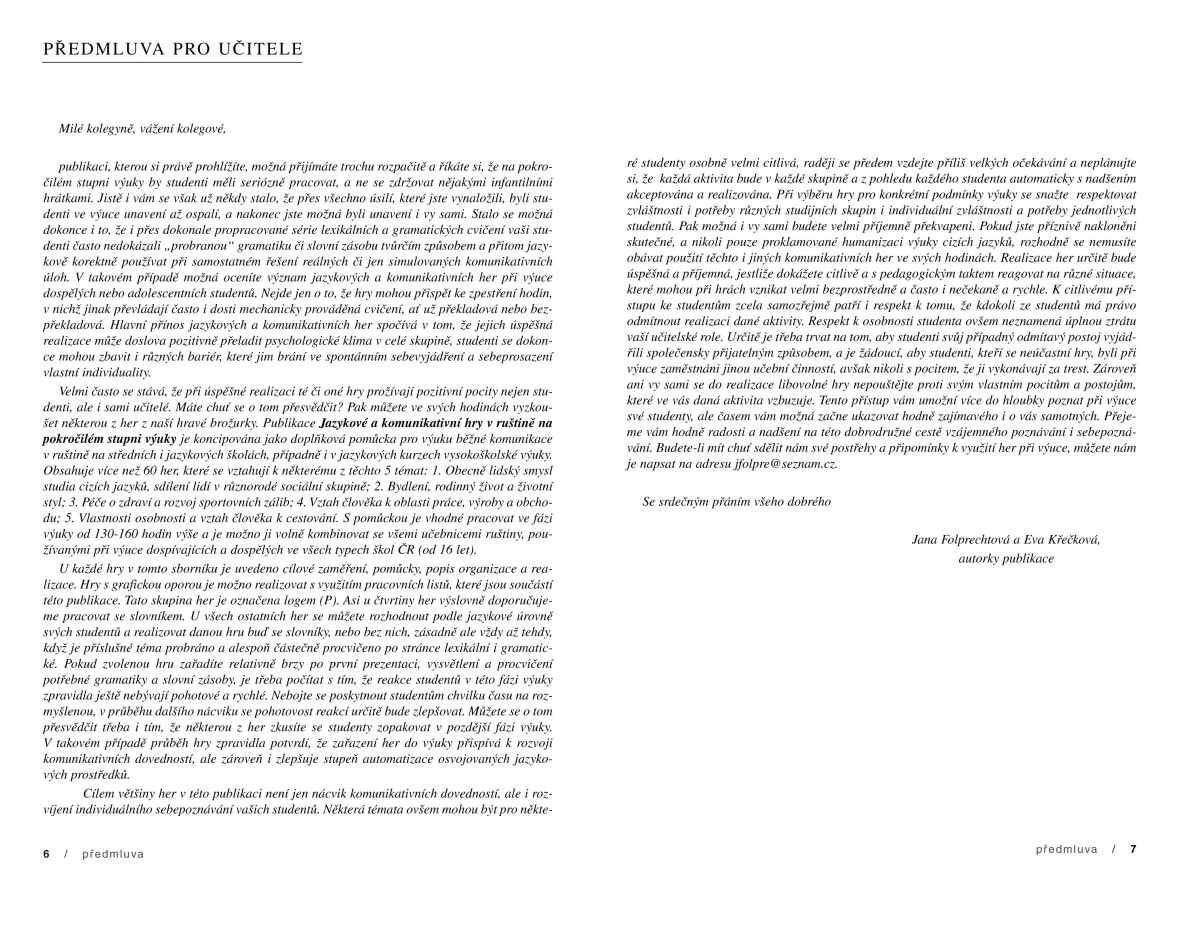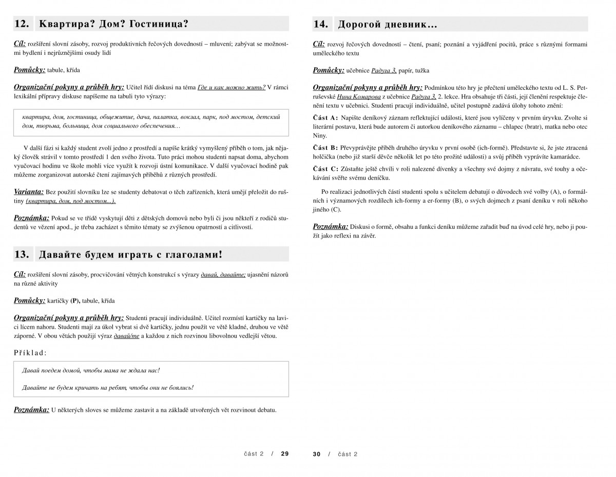 Publikace je koncipována jako doplňková pomůcka pro výuku běžné komunikace v ruštině na středních i jazykových školách, případně v jazykových kurzech vysokoškolské výuky. Obsahuje více než 60 her, které se vztahují k některému z těchto 5 témat: 1. Obecně lidský smysl studia cizích jazyků, sdílení lidí v různorodé sociální skupině; 2. Bydlení, rodinný život a životní styl; 3. Péče o zdraví a rozvoj sportovních zálib; 4. Vztah člověka k oblasti práce, výroby a obchodu; 5. Vlastnosti osobnosti a vztah člověka k cestování. S pomůcku je vhodné pracovat ve fázi výuky od 130–160 hodin výše a je možno ji volně kombinovat se všemi učebnicemi ruštiny, používanými při výuce dospívajících a dospělých ve všech typech škol ČR (od 16 let).