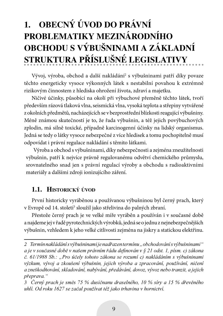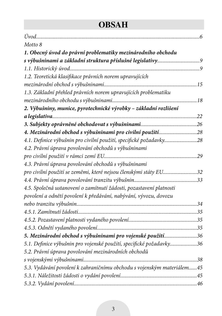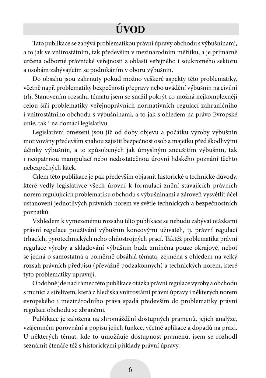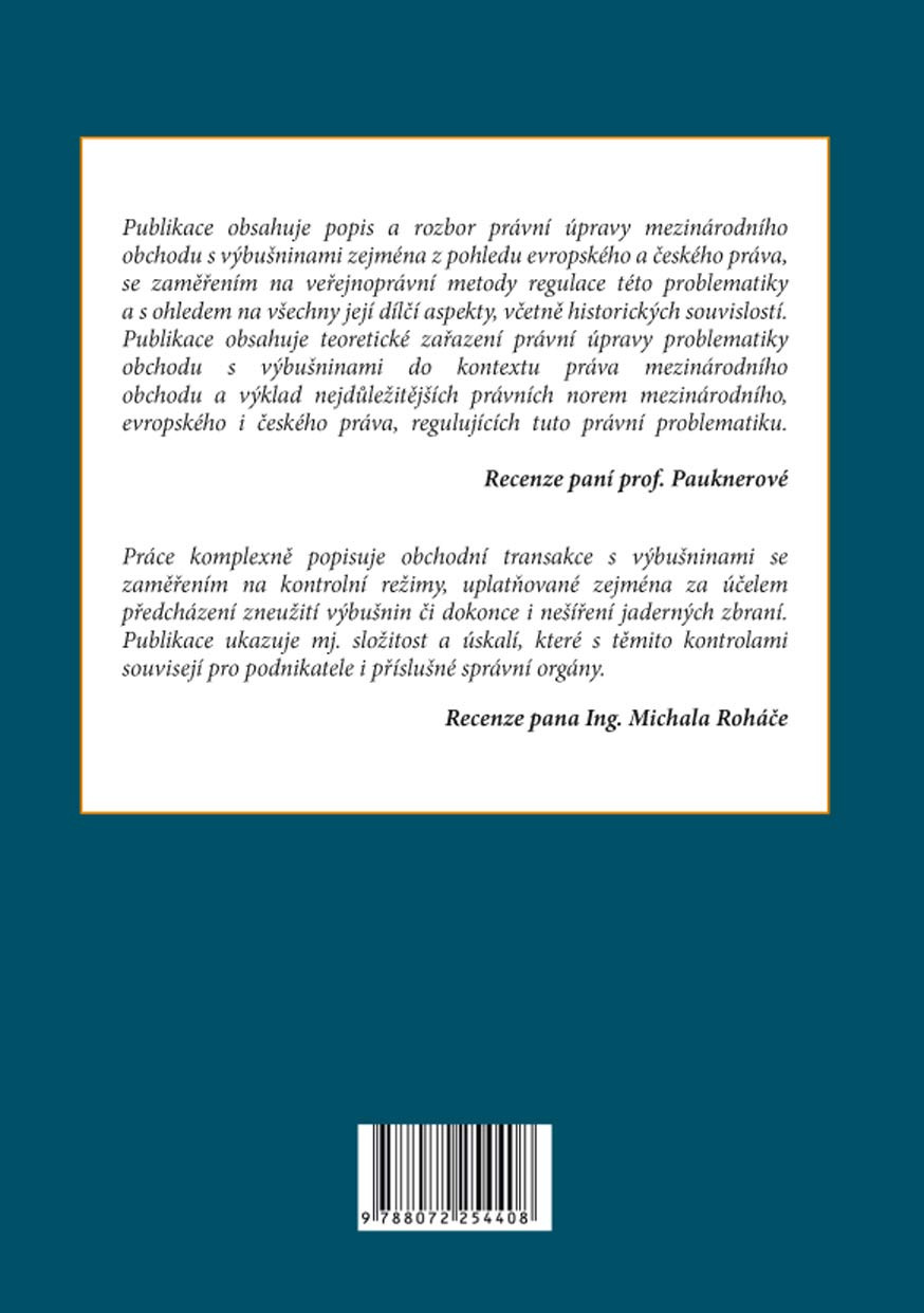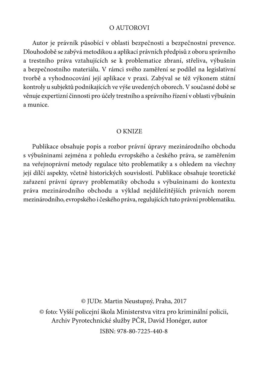 Publikace obsahuje popis a rozbor právní úpravy mezinárodního obchodu s výbušninami zejména z pohledu evropského a českého práva, se zaměřením na veřejnoprávní metody regulace této problematiky a s ohledem na všechny její dílčí aspekty, včetně historických souvislostí. Publikace obsahuje teoretické zařazení právní úpravy problematiky obchodu s výbušninami do kontextu práva mezinárodního obchodu a výklad nejdůležitějších právních norem mezinárodního, evropského i českého práva, regulujících tuto právní problematiku.