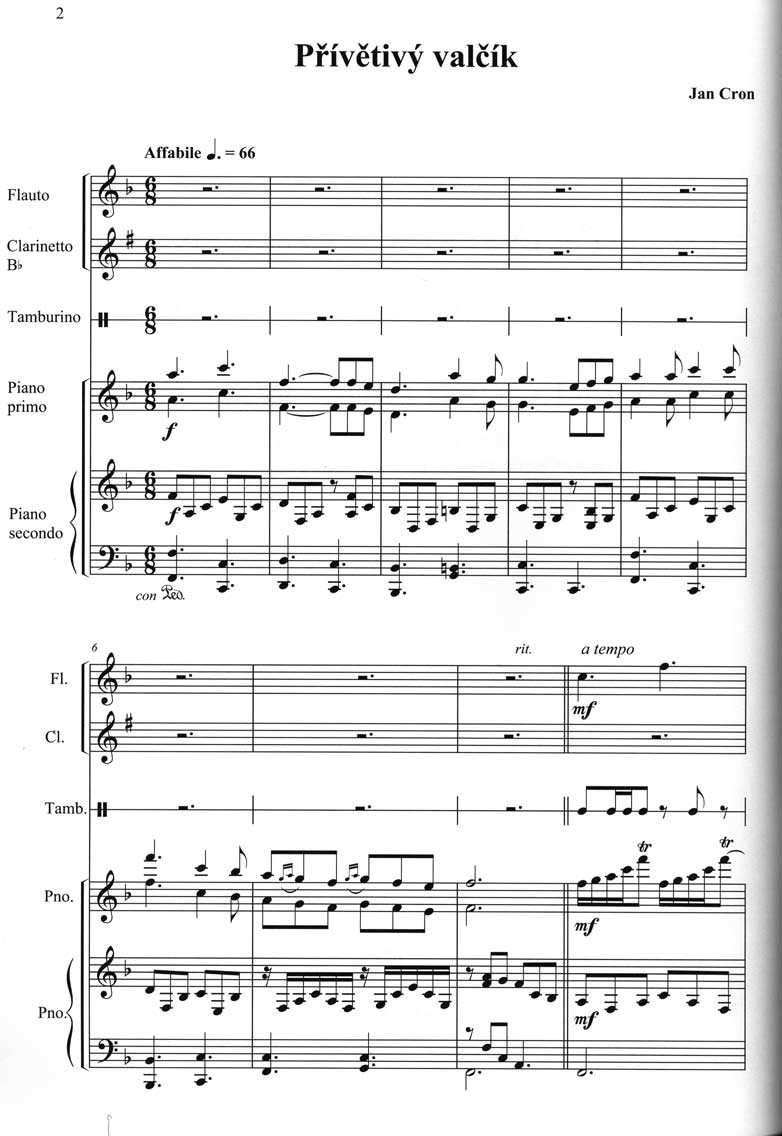 Notová publikace Jana Crona pro flétnu, klarinet, klavír na čtyři ruce a tamburínu. První klavír je zapsán do jedné notové osnovy, záleží na interpretovi, jaký prstoklad v rukou zvolí. Po ukončení studia na gymnáziu nastoupil v roce 1979 na ostravskou Janáčkovu konzervatoř do třídy prof. Alexandra Dědiny na obor kytara. Během studia konzultoval hudební repertoár u prof. Štěpána Raka. Následovaly koncerty sólové, komorní i účinkování v žánrově odlišných sestavách. Zároveň měla odborná i laická veřejnost možnost seznámit se s tvorbou mladého hudebníka prostřednictvím jeho spolupráce s ostravským rozhlasem. Následně se uplatnil i v ostravském televizním studiu coby autor scénické hudby a hudební režisér. Souběžně s touto bohatou činností působil jako pedagog a komponoval skladby pro žáky hudebních škol. Jeho tvorbu můžeme vnímat jako hudbu nekonvenční, spojující moderní prvky s klasickými, instrumentálně i harmonicky bohatou. Cronova odpověď současné hudební „nadprodukci“ spočívá v tvůrčí invenci a identickém chápání prvotní životní a hudební etiky, tedy potřebou harmonie jako kategorického imperativu – v hudbě i životě. Z konkrétní tvorby můžeme jmenovat CD písní anglického renezančního skladatele J. Dowlanda (se zpěvačkou L. Halamovou a kytaristou M. Ládrem) vydanou u Melantricha v r. 1995. V současné době spolupracuje s kanadským, u nás žijícím pedagogem, překladatelem a hudebním nadšencem M. Landrym, s nímž již v roce 1994 vydal u Montanexu knížku Let´s sing in English.