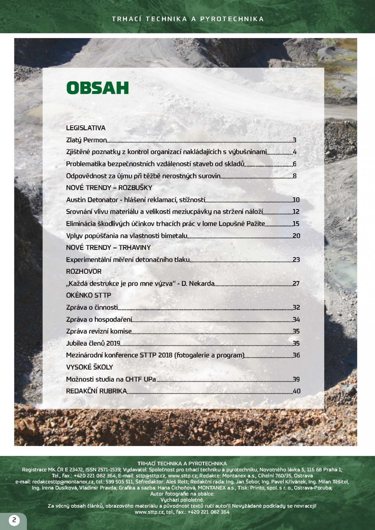 Časopis je rozdělen na rubriky Legislativa, Nové trendy (rozbušky, trhaviny, vrtací nářadí), Rozhovor, Okénko STTP, Vysoké školy ad.