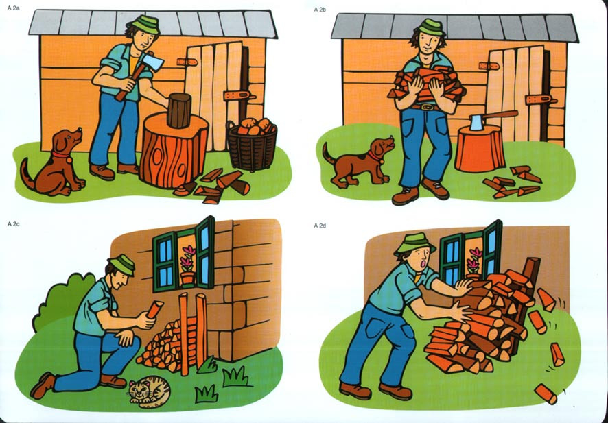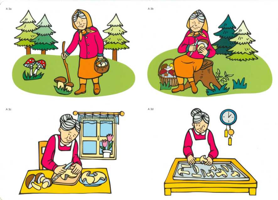 Táta seká dříví Táta nese dříví Babička hledá houby Babička čistí houby