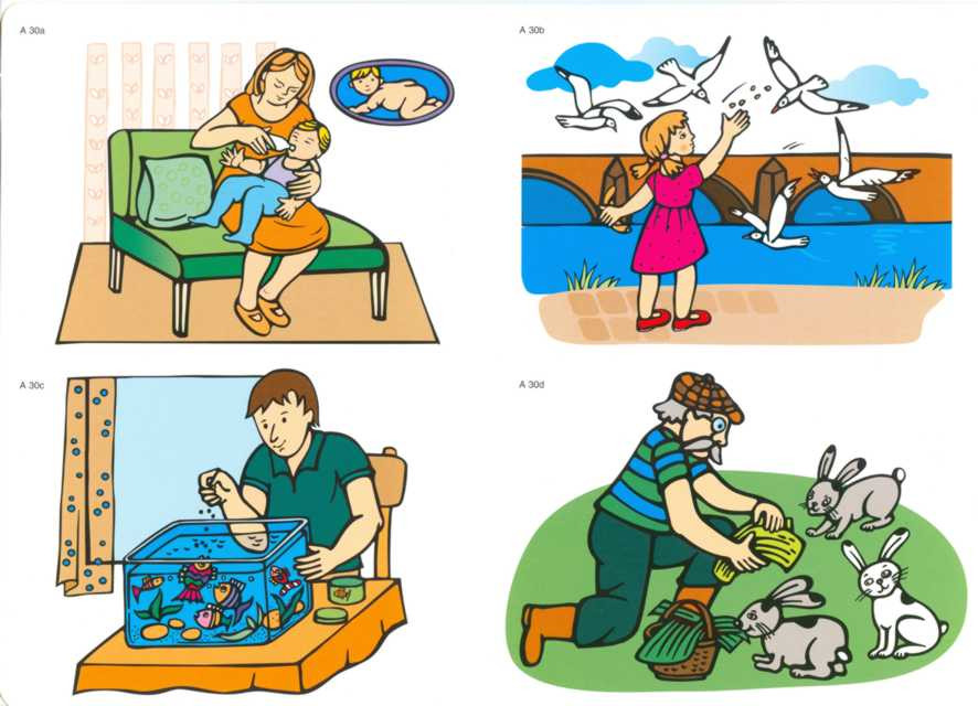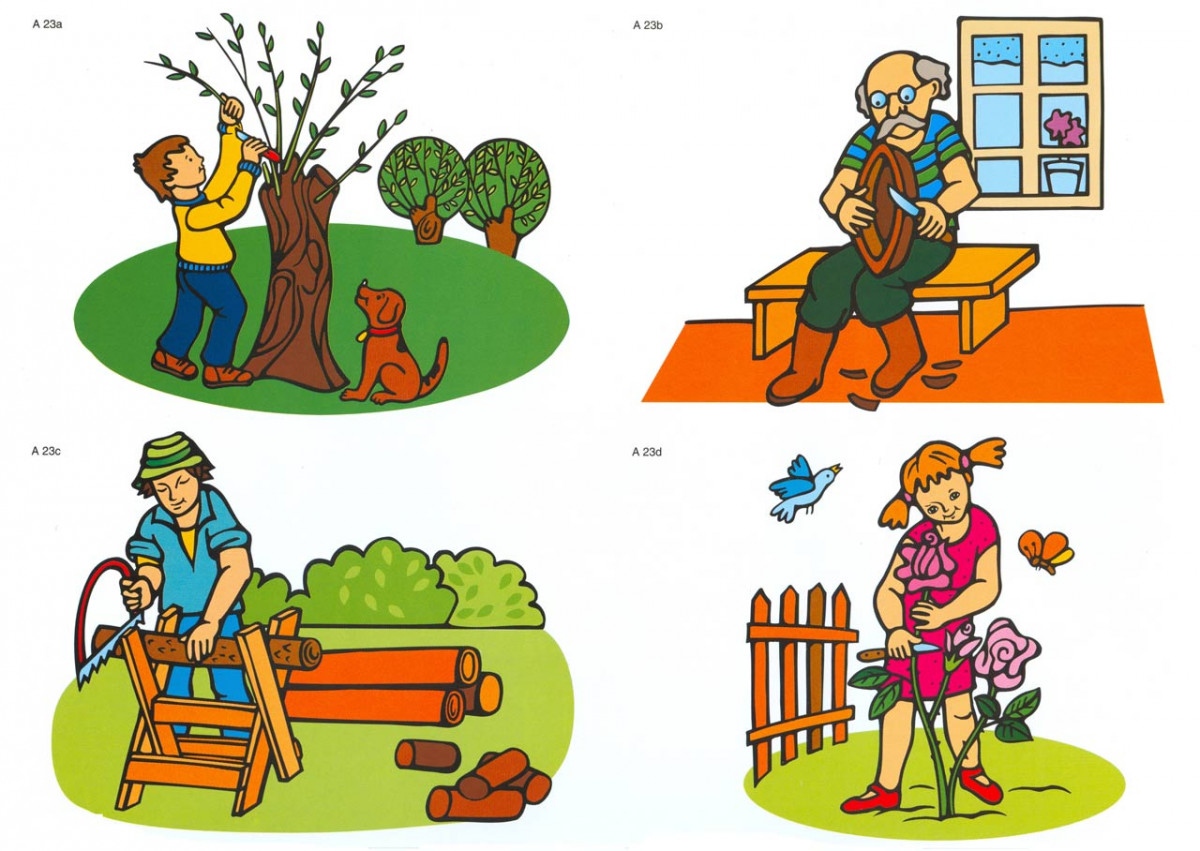 Táta řeže dříví Jana řeže růži Táta krmí rybičky Děda krmí králíky