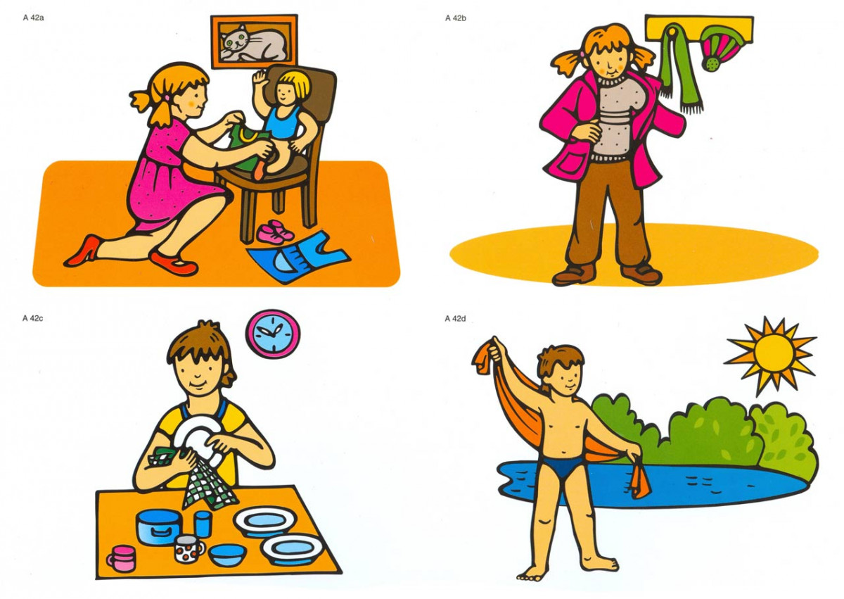 Soubor obsahuje 200 obrázků, které vyjadřují jednoduché děje. V řečovém komentáři k jednotlivým obrázkům je ve čtveřici obrázků obměňován přísudek, podmět, příslovečné určení místa v souvislosti s užíváním předložek, ve dvojicích obrázků pak užití či neužití zvratného zájmena „se“, “si“ či užívání částic „se“, “si“ zvratných sloves.