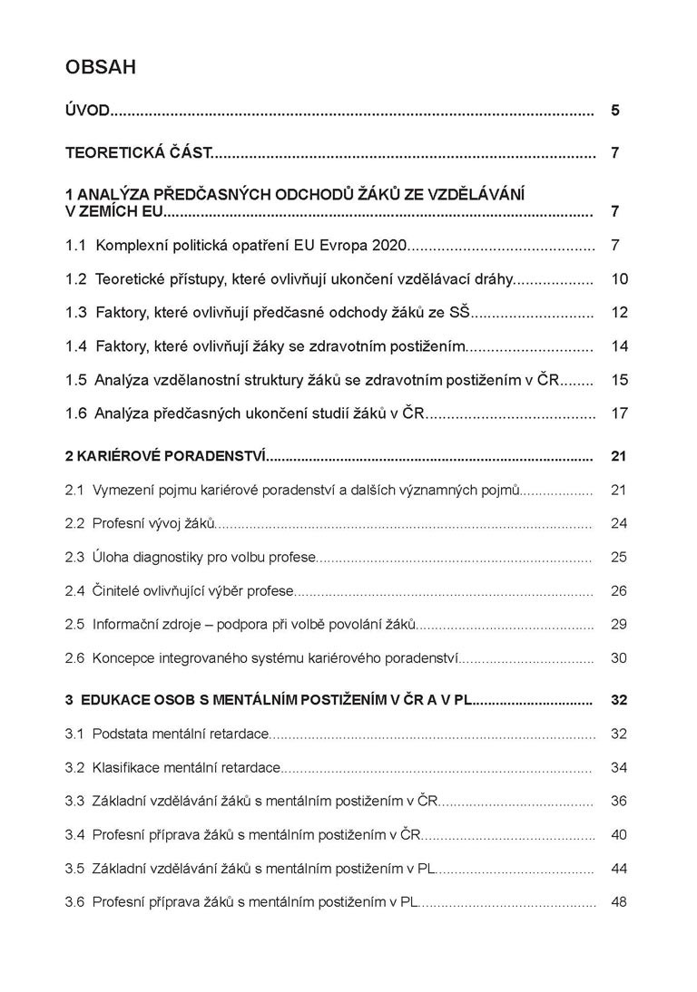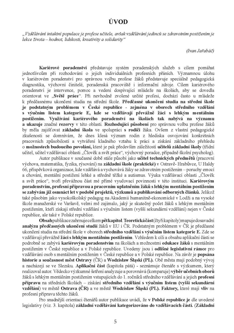Odborná publikace s názvem „Komparace profesní orientace žáků s mentálním postižením“ se zabývá problematikou „kariérového poradenství“ u žáků s lehkým mentálním postižením na základních a středních školách v České republice a v Polsku. Práce je v mnoha ohledech důležitým počinem na poli speciální pedagogiky a srovnávací pedagogiky, protože zkoumá úroveň profesní přípravy a profesního uplatnění žáků s LMP na pozadí dvou rozdílných školských systémů, českého a polského. Teoretická část odborné publikace mapuje dosavadní analýzu předčasných ukončení studií žáků v ČR, kde podstatným problémem je předčasné ukončení studia na střední škole v oborech středního vzdělání s výučním listem kategorie E. Zde se vzdělávají převážně žáci s lehkým mentálním postižením. Podrobně se zabývá „kariérovým poradenstvím“ na školách a možnostmi edukace žáků s mentálním postižením (včetně rozdílného legislativního rámce) v České republice a v Polské republice. Na závěr je popsána historie a současnost měst Ostravy (ČR) a Wodzisław Śląski (PL), kde byl realizován autorem výzkum. Aplikační část odborné publikace komparuje skutečný počet žáků s lehkým mentálním postižením, kteří získají střední vzdělání s výučním listem (vyšší sekundární vzdělání) ve městě Ostrava a ve městě Wodzislawi Śląski. Porovnává také výběr učebních oborů žáků s lehkým mentálním postižením ve městě Ostrava (ČR) a ve městě Wodzisław Śląski (PL), vstupujících do 1. ročníků středního vzdělávání. Závěr knihy obsahuje i doporučení, prognózu a možnosti využití v obou zkoumaných městech. Publikace je pro čtenáře vhodně doplněna obrázky, prostorovými grafy i tabulkami.